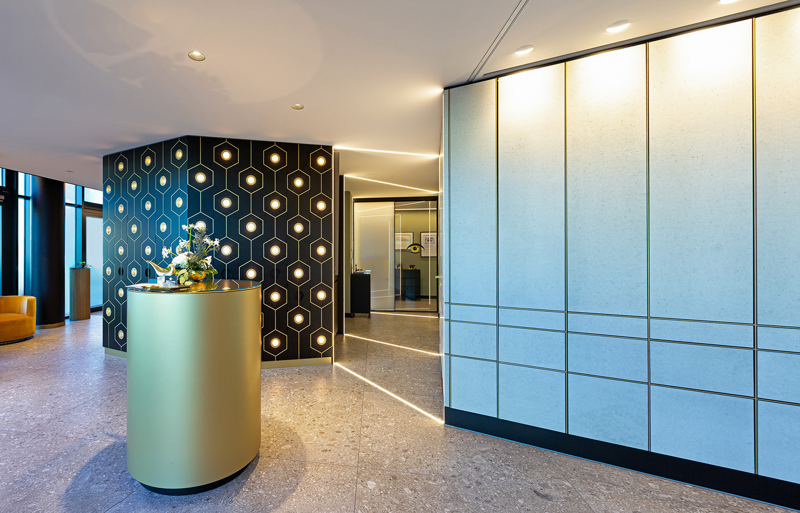 Die Architektur verbindet Präzision mit Aufenthaltsqualität: grafische Wandstrukturen treffen auf weiche Formen im Kundenbereich, während gezielt gesetzte Lichtakzente Orientierung schaffen und sowohl Produkte als auch Beratungssituationen gleichermaßen in Szene setzen.